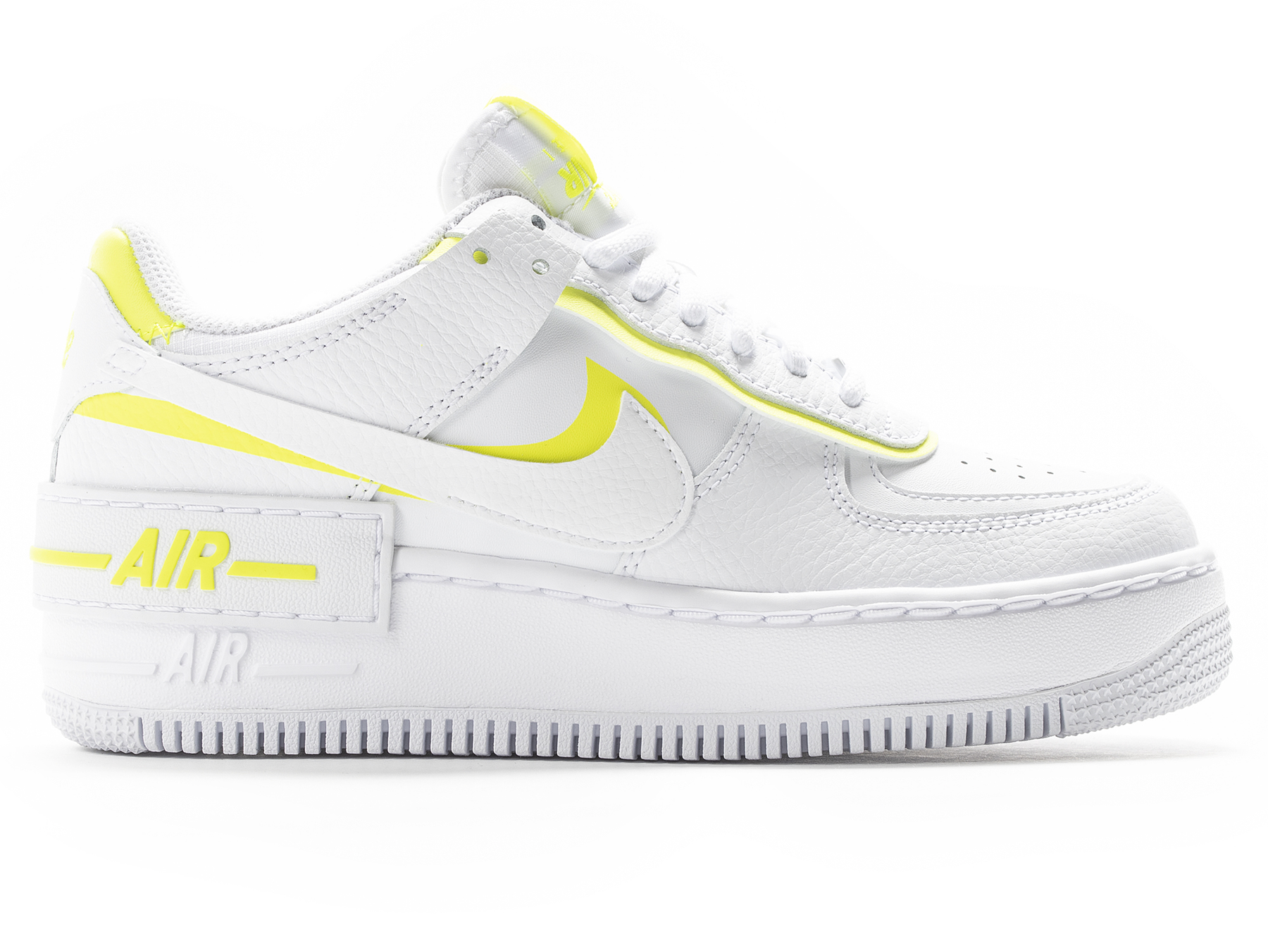 The Nike Air Force 1 Shadow WhiteLemon has a smooth leather upper and adopts a layered construction to play with proportions, while still retaining the codes of the brand's must-have model. There is a white base, contrasted by touches of neon yellow in the lined elements such as the swoosh, eyelets, AIR tag and heel. The design is finalized by a slightly oversized sole compared to the initial model.