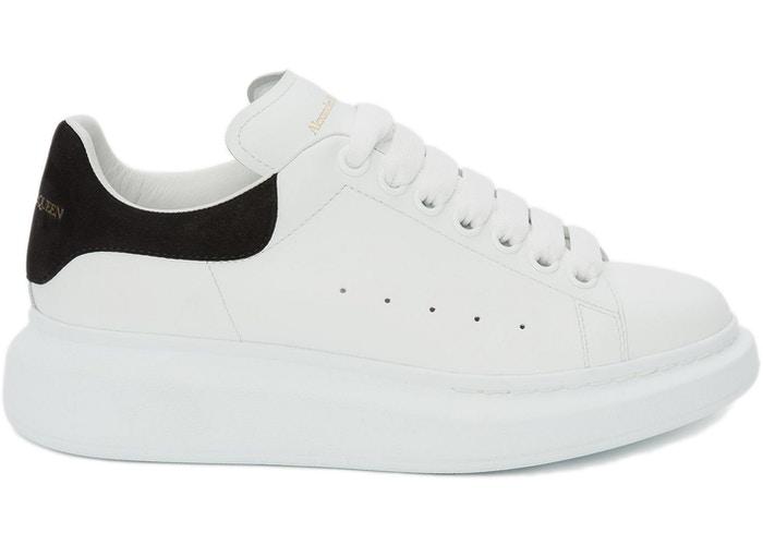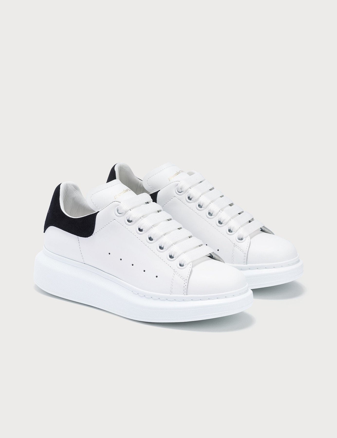 Alexander McQueen often wore sneakers when working on new designs in the studio. These white and blue leather Oversized low-top sneakers from Alexander McQueen feature a thick rubber sole, a contrasting heel counter, a lace-up front fastening and a round toe.