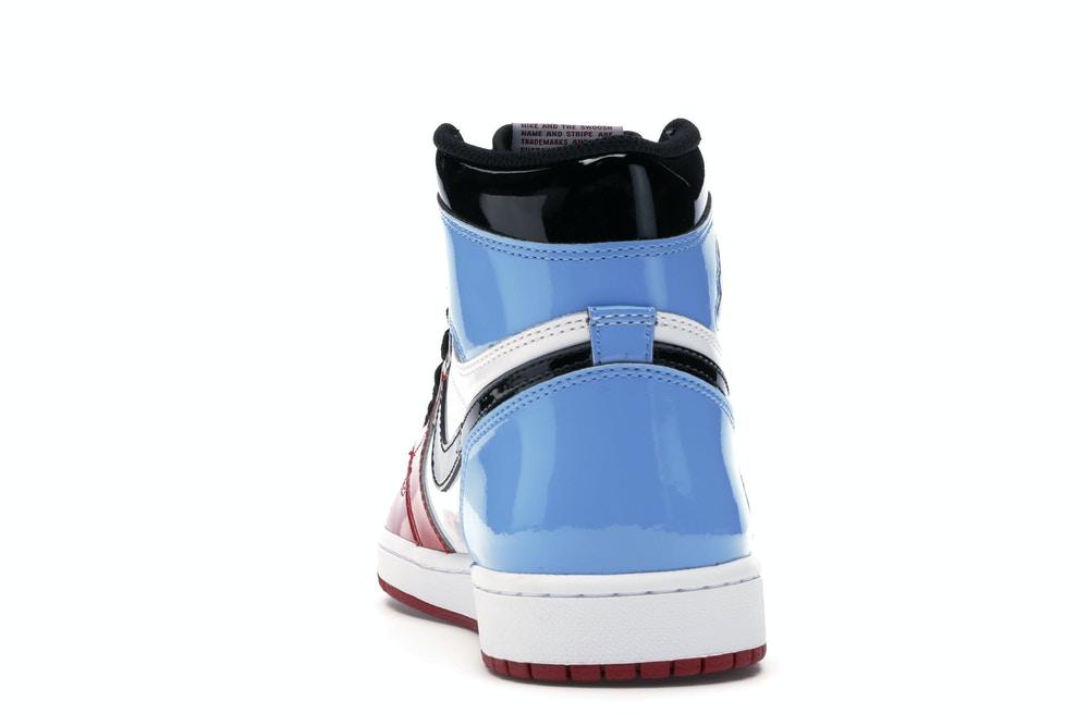 This AJ 1 is composed of a white patent leather upper with red and university blue overlays, black Nike “Swoosh”, white midsole, and a red outsole. These sneakers released in November of 2019.