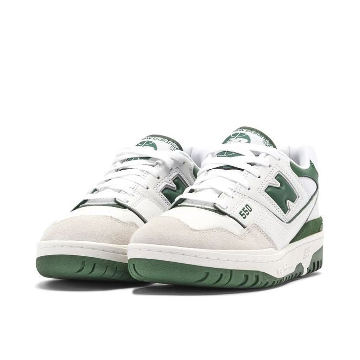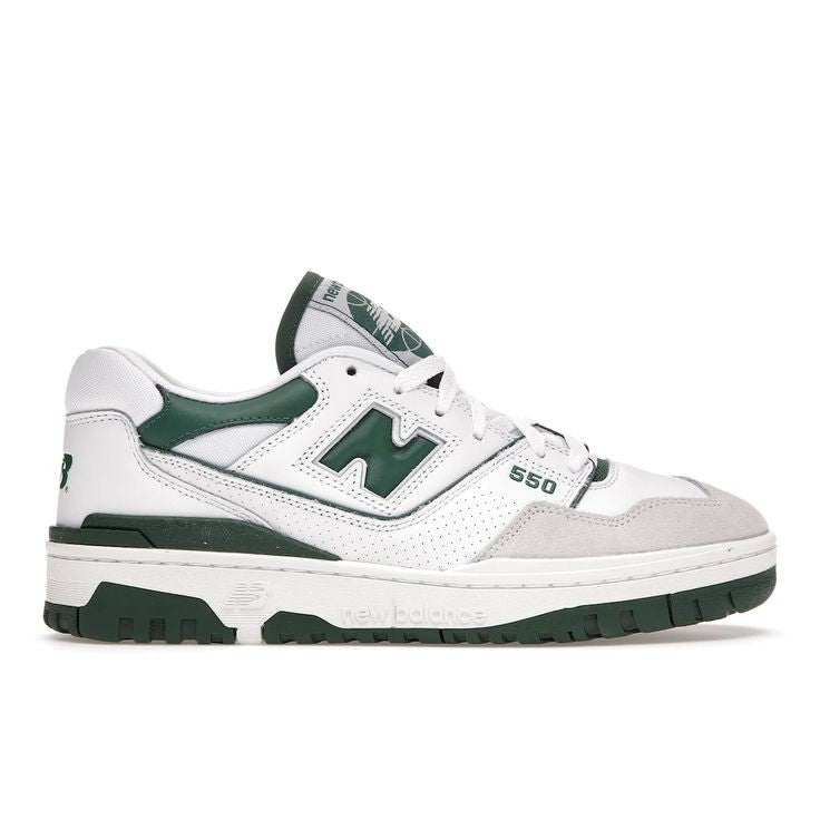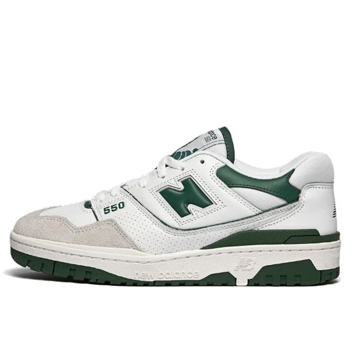 The New Balance 550 Green is a timeless sneaker that blends vintage basketball style with modern streetwear appeal. It features a low-top silhouette with a clean, classic design. The upper is constructed from premium leather and perforated panels, offering durability and breathability. Accented with rich green details on the "N" logo, heel tab, outsole, and tongue branding, the green colorway adds a vibrant yet understated touch to the predominantly white base.