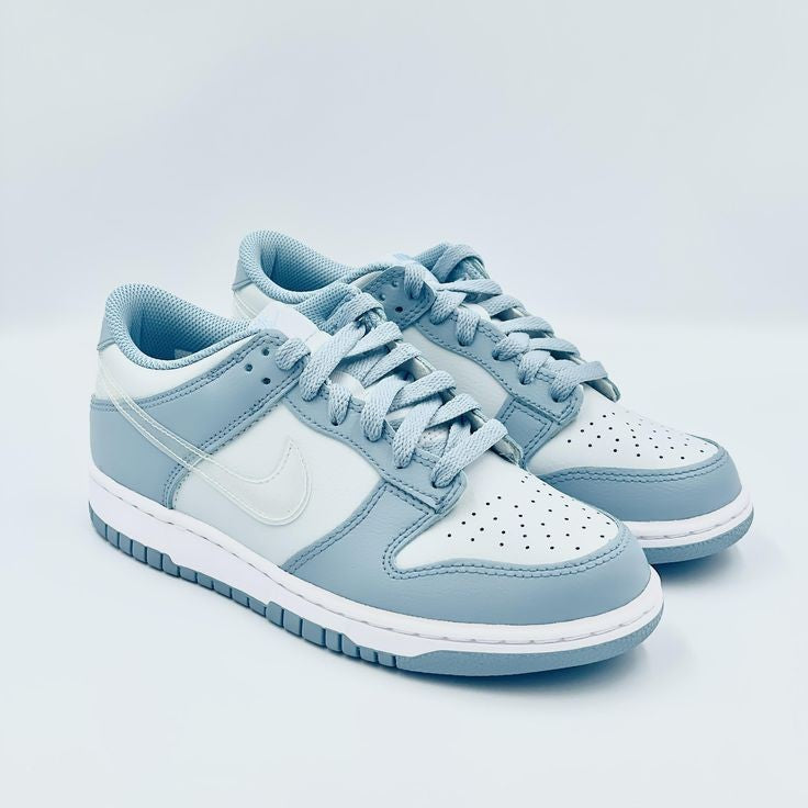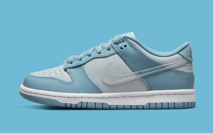The Nike Dunk Low "Clear Swoosh Blue" features a fresh and vibrant design, combining the iconic Dunk Low silhouette with a striking color scheme. The upper is primarily made up of a smooth white leather base, providing a clean and minimalist look. The standout feature is the translucent clear blue Swoosh, which adds a modern, futuristic twist to the classic design. The clear blue swoosh creates a striking contrast against the white leather, giving the sneaker a sleek and elevated look. The color palette may also include touches of soft grey or light blue accents around the midsole and outsole, enhancing the overall fresh and clean aesthetic of the shoe.
